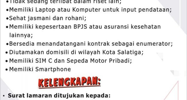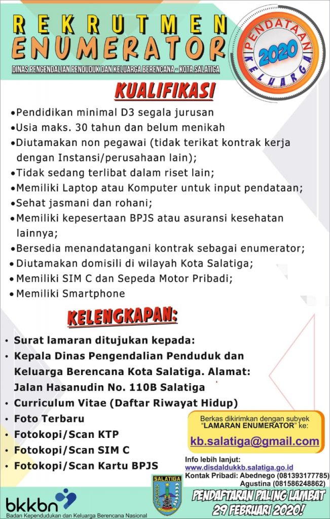 Penerimaan Enumerator DISDALDUKKB Kota Salatiga 2020 dinkopukm12 Februari 2020 dilihat: 1,683 Dinas Pengendalian Penduduk dan Keluarga Berencana Kota Salatiga membutuhkan tenaga Enumerator dengan Kualifikasi sebagai berikut: Untuk Informasi Lebih Lengkap, Dapat Menghubungi Kontak yang tertera di atas.